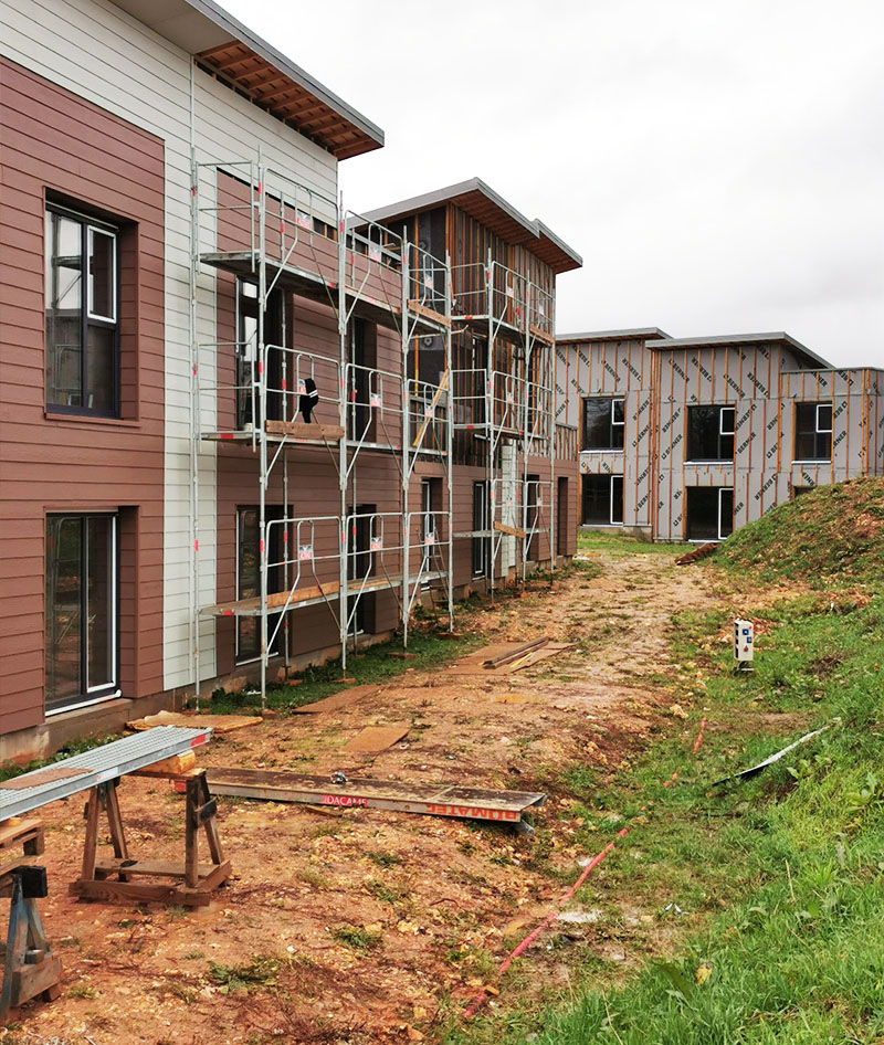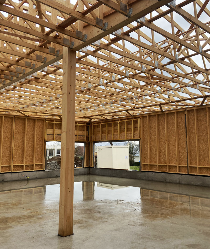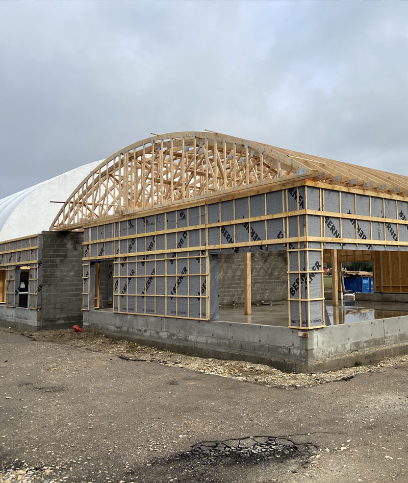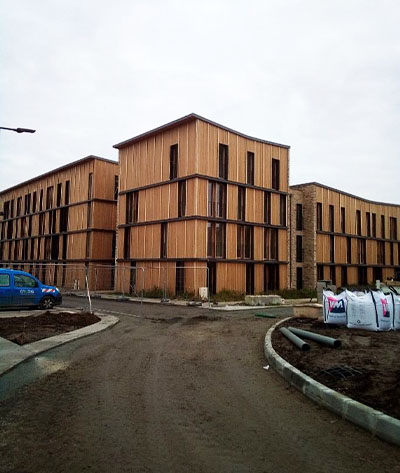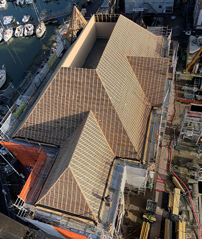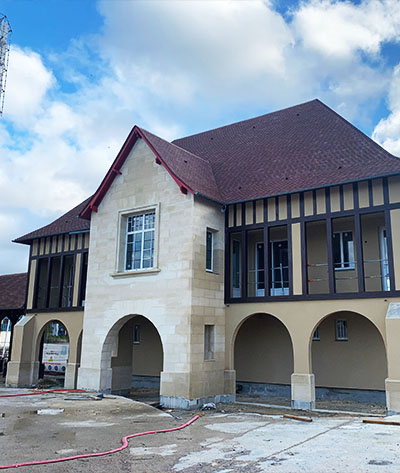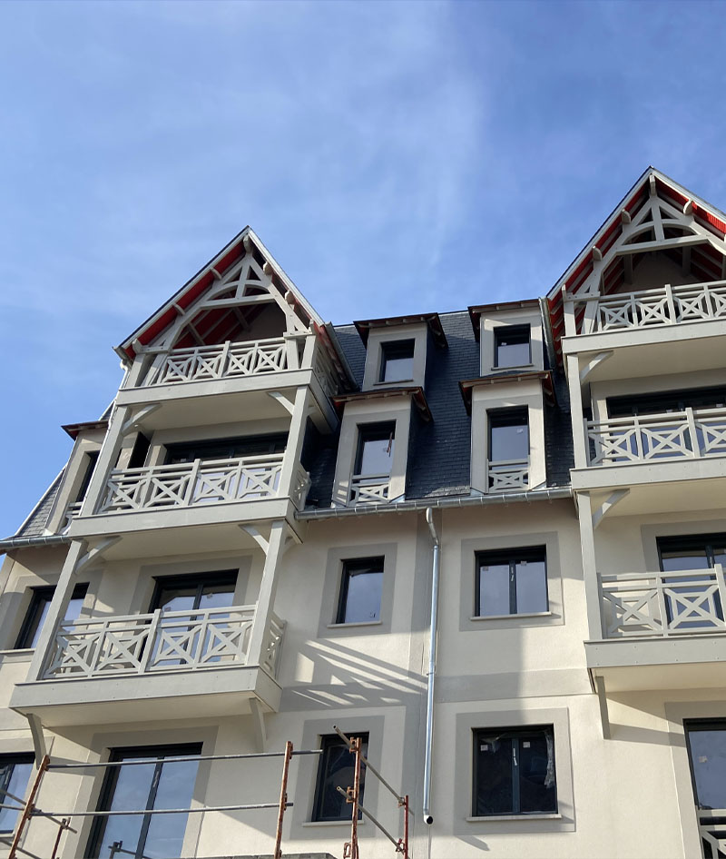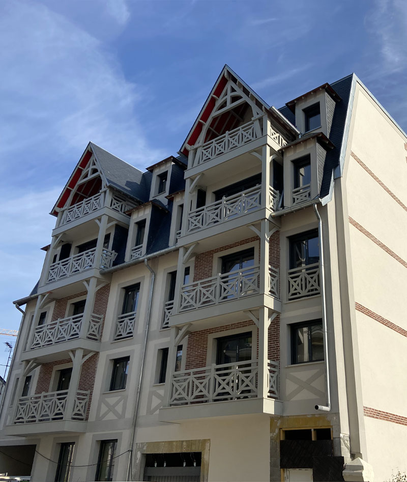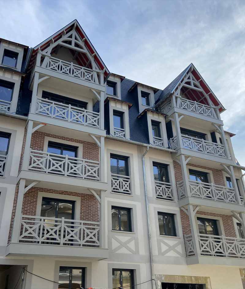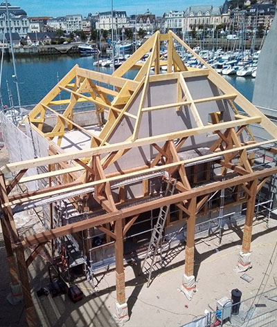 Réalisation d’un hôtel Premium pour le compte de Pierre & Vacances sur la presqu’île de la Touques sur la commune de Deauville. Charpente traditionnelle avec fermes cintrées. Chantier HQE.